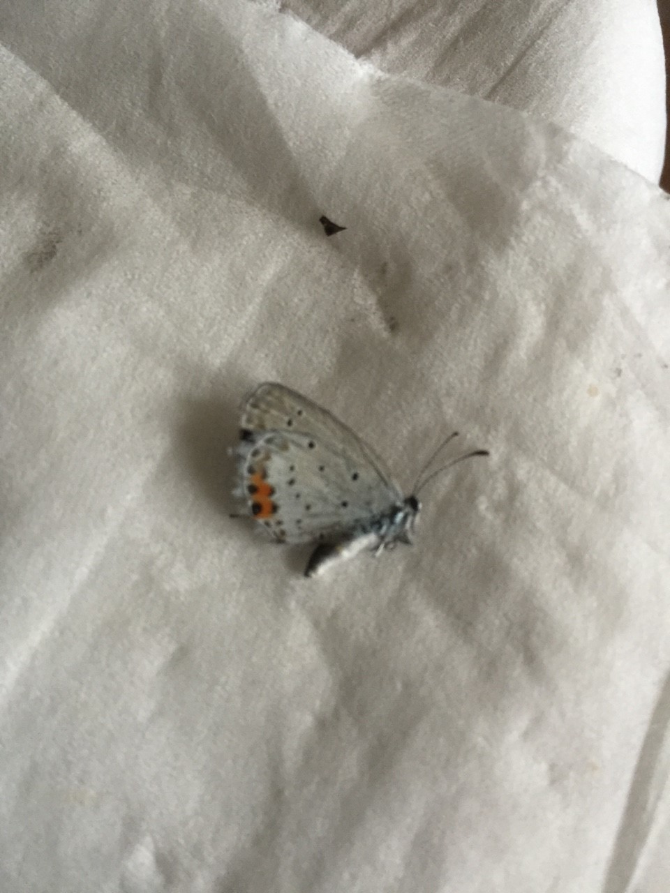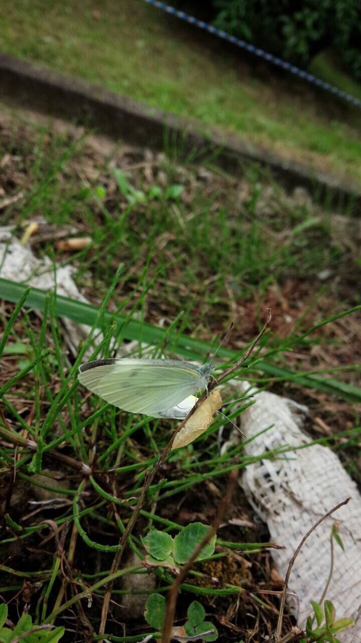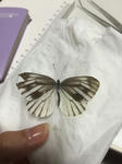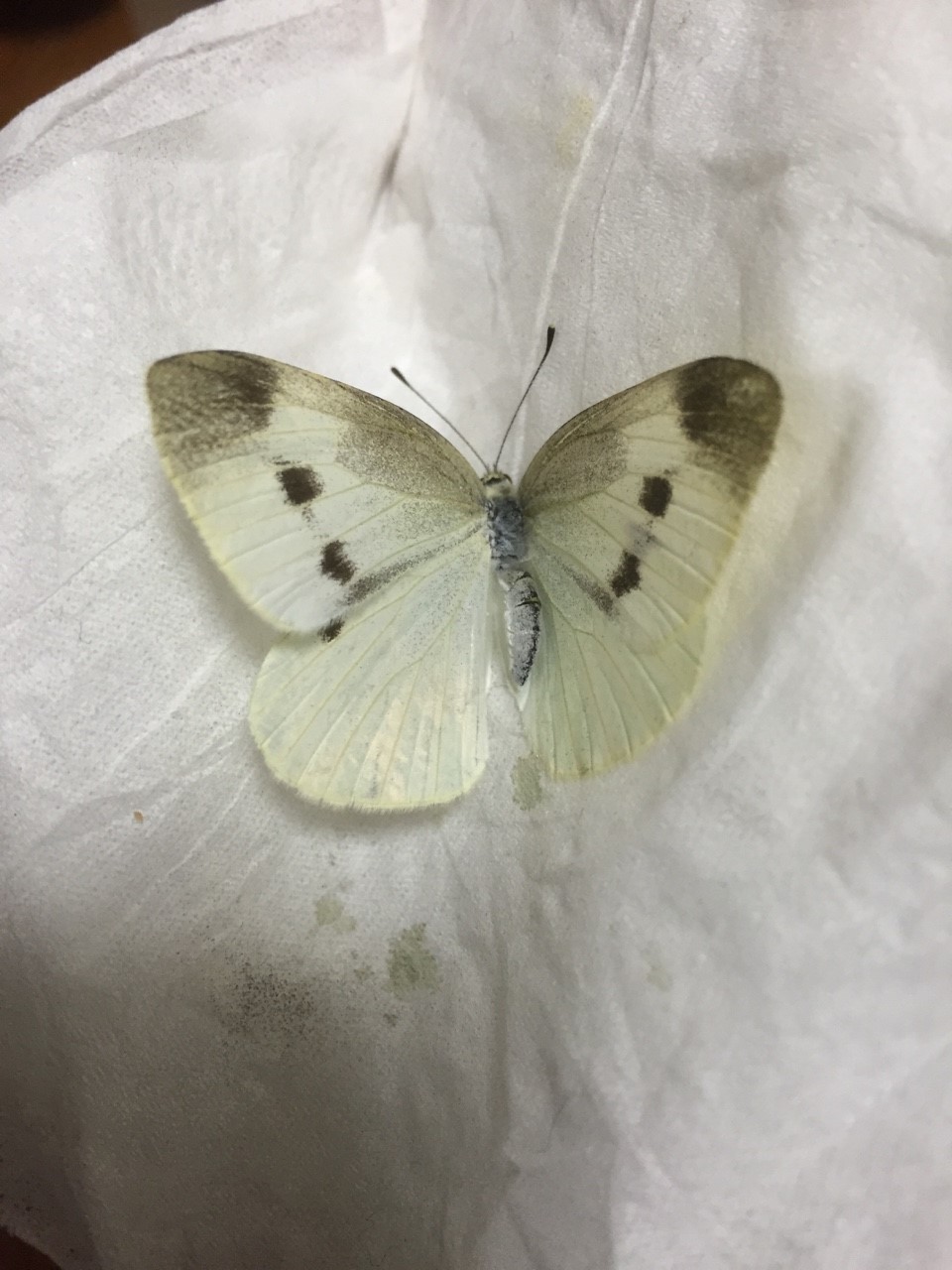 上のスジクロシロチョウとの比較のために捕獲しました。飛んでいる姿を見ると、一見モンシロチョウに見間違えるスジクロシロチョウですが、表の翅を見ると違いは一目瞭然です。