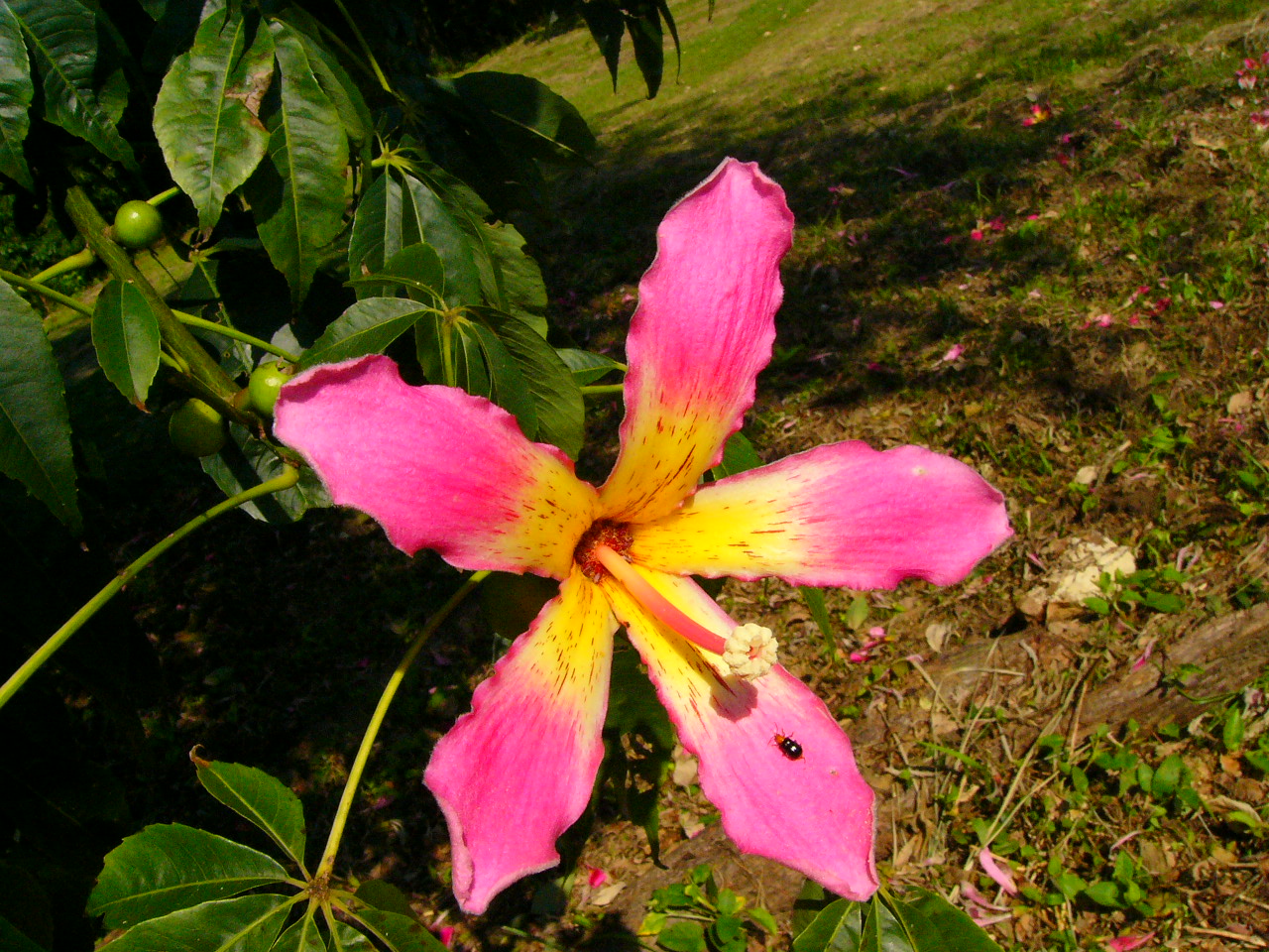 木本のトックリキワタです。遠目から見てもよく目立つ木です。緑生い茂る中、派手なピンク色!