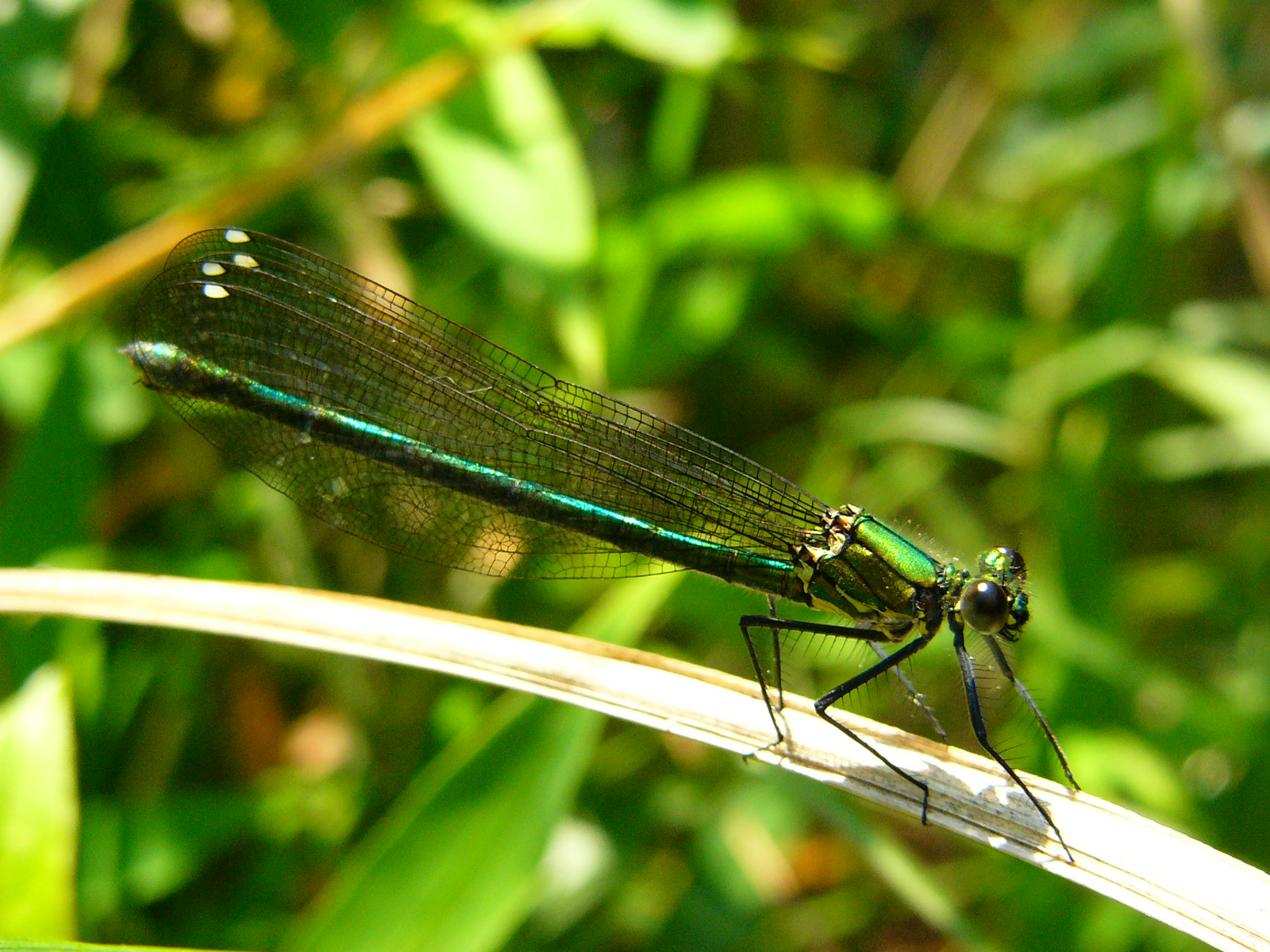 尻尾側がエメラルドグリーンで太陽光を反射して輝いていました。上部は金緑色かな? 翅の白い斑点が特徴的ですね。宝石みたいで見惚れてしまいました。